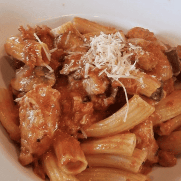 Rigatoni pasta with grilled chicken , mushrooms in a creamy marinara sauce, Green salad