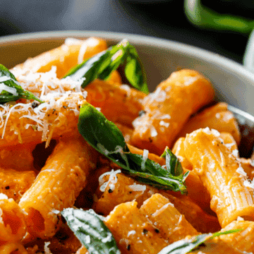 Rigatoni pasta with mushrooms in a creamy marinara sauce, Green salad