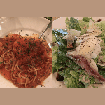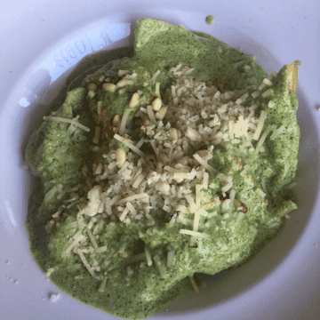 Leek Pasta with creamy pesto sauce, pine nuts and Parmesan cheese; one green salad with a side of dressing and bread