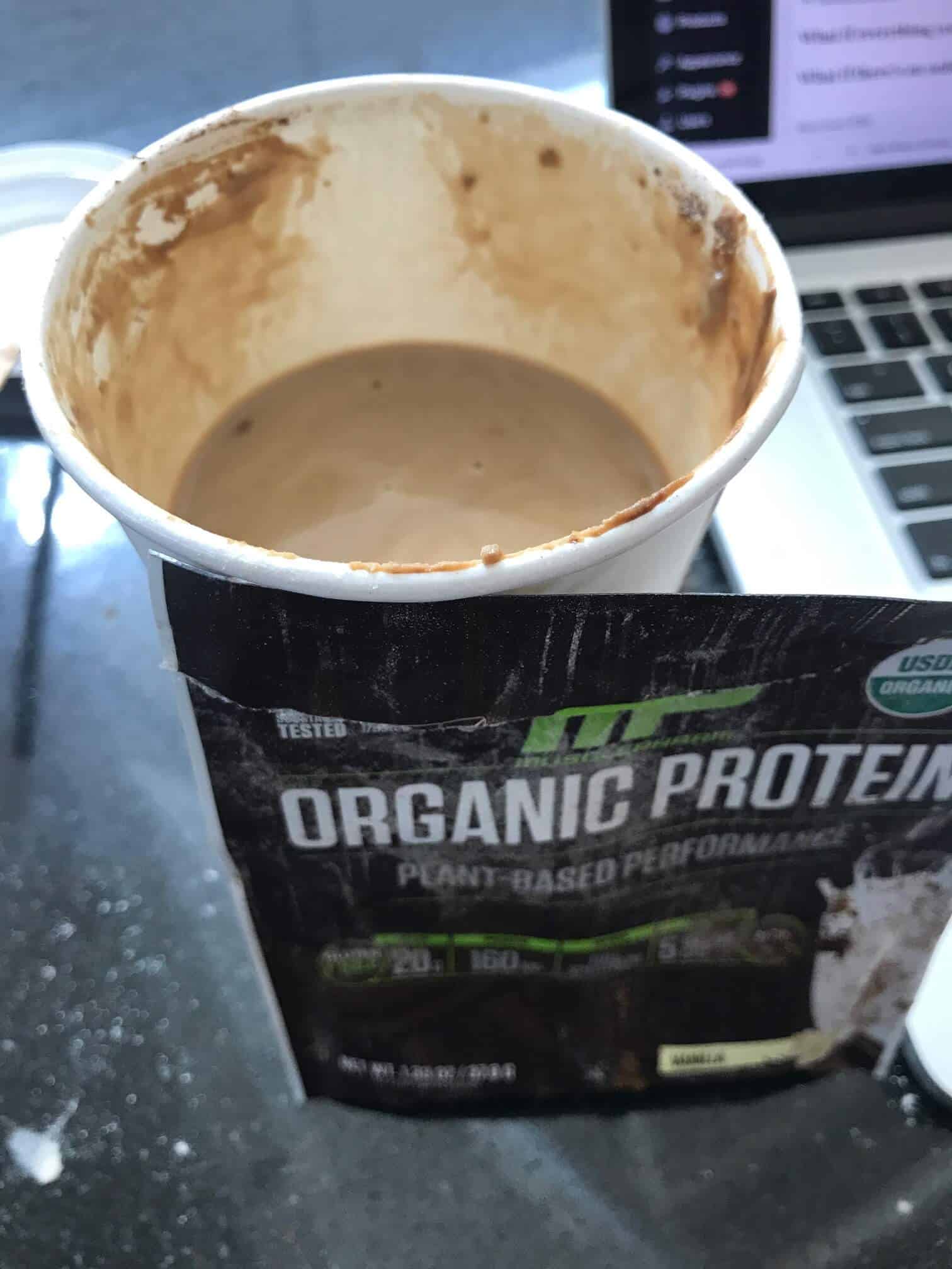 Sitting at the Ft. Lauderdale airport I had this divine inspiration out of desperation to blend them both in hot water. The instructions for the protein powder are to mix it with cold water. So typically I blend it with half a glass of cold water and gulp it like a supplement whenever I haven’t had enough protein for the day. I had no idea what would happen if I blended it in hot water.